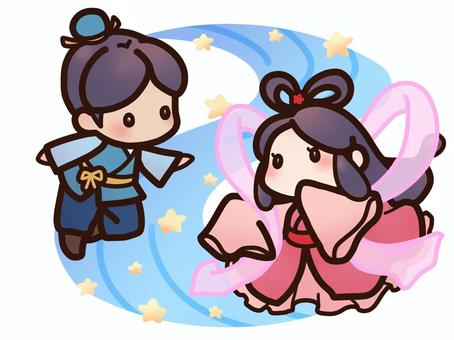 The diligent Orihime was talented in her craft and her father – God – often enjoyed her masterpieces. Due to her work, Orihime felt dejected as she lacked both the opportunity and time for romantic encounters. In order to cheer his daughter up, God arranged for Orihime to meet Hikoboshi, a cowherd who lived across the Milky Way. The meeting was a success as the two fell head over heels for each other. Soon after, Hikoboshi took Orihime as his wife.