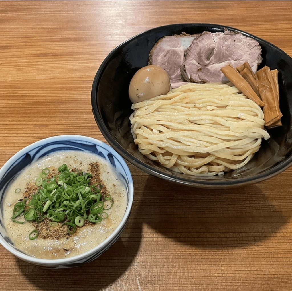 濃厚な豚骨スープと、鰹節と煮干しのうまみが溶け込んだ濃厚なスープに、しっかりとした食感の太麺を合わせました。このラーメンは、”魚介豚骨醤油つけ麺 “と名付けられました。豚骨は日本語で「豚の骨」を意味し、「魚介」は湖や川、海など水辺の食材を意味する言葉です。ラーメンに関しては、鰹節、鯖、鰯を総称して “魚介” と呼んでいます。