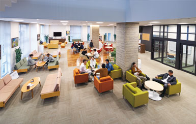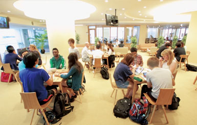 Starting with Campus 1, the first building you encounter after entering the university gates is located on your left. Inside this building, you will find the library, English Plaza, and Innovation Lab. Our library boasts an impressive collection of over 35,000 books in various languages. As expected, it provides excellent solo studying spots and an interesting selection of the latest academic papers and articles. The English Plaza serves as an international exchange hub where students can relax and socialize with one another. It is also the place to go for meeting English conversation partners and receiving academic advice.